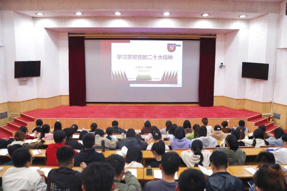 4月27日,beat365在线体育官网登录入口党委书记高尚宇线上讲授“学习贯彻党的二十大精神”专题党课。学院第38期入党积极分子在四号楼报告厅集体听课学习。