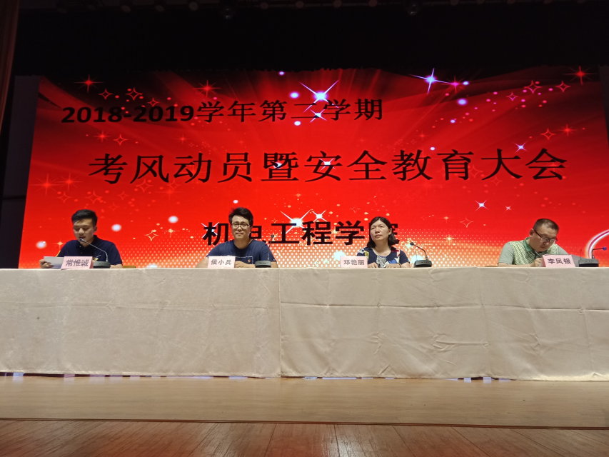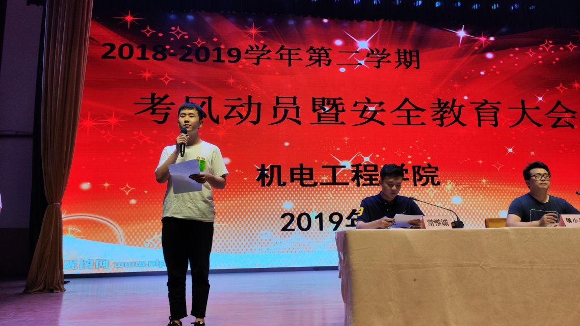 为了进一步规范学院学生考试行为,严肃考风考纪,提高学生学习积极性和主动性,提高学生安全意识,进一步提升综合素质,2019年6月4日,机电工程学院在学校大礼堂举行了2018-2019学年第二学期考风动员暨安全教育大会。