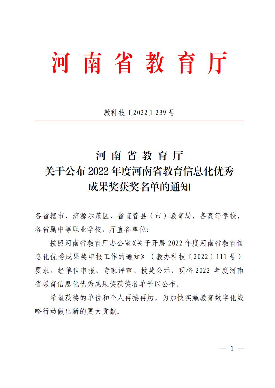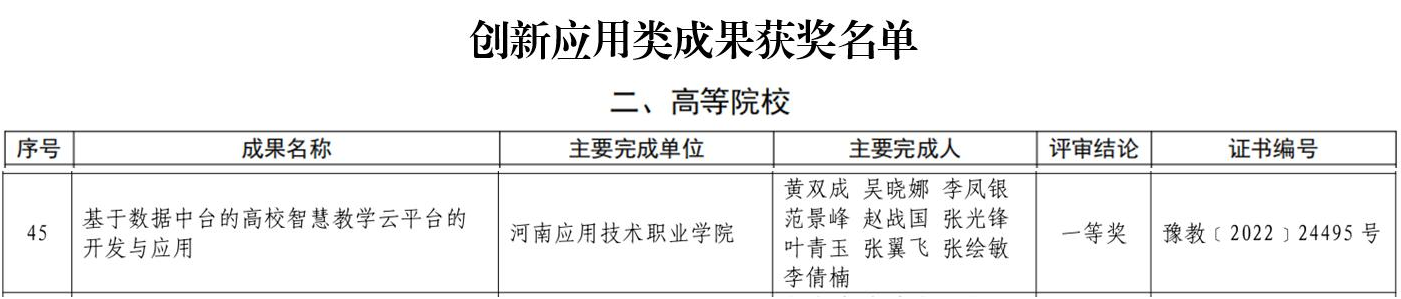 近日,河南省教育厅发布了《河南省教育厅关于公布2022年度河南省教育信息化优秀成果奖获奖名单的通知》(教科技〔2022〕239号)文件,公布了2022年度河南省教育信息化优秀成果奖获奖名单。我院“基于数据中台的高校智慧教学云平台开发与应用”荣获高校创新应用类成果一等奖。