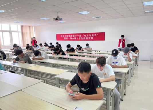 预赛阶段为理论知识考试环节,考验的是选手们对理论知识掌握的程度。预赛内容为实验室安全、疫情防控、消防安全、电工电子基础知识、电机控制基础知识、传感器基础知识、PLC基础知识等。在学院精密安排和组织下,选手们全神贯注,认真答题,预赛考试现场严肃有序,最终共有41位同学进入决赛。