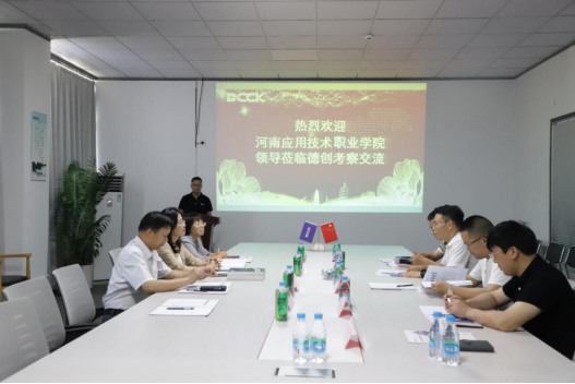 滕文锐一行首先在苏州德创测控科技有限公司进行校企交流,公司总经理葛大伟对滕文锐一行来访表示热烈欢迎。双方就校企合作,特别是随企出海、共建海外实训基地、联合工程师培养、海外师资培训等方面的问题进行了深入交流。