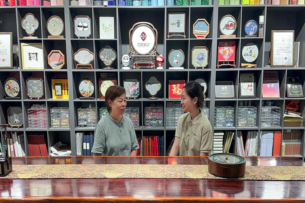 苏绣艺术博物馆内,一幅幅精美的苏绣作品令团队成员叹为观止。细腻的针脚、生动的构图、逼真的效果,充分展现出苏绣作为“东方艺术明珠”的独特魅力。实践体验环节,非遗传承人耐心示范握针手法与运线技巧,队员们认真练习,通过反复拆补和调整,针脚逐渐变得平整有序。通过亲身实践,队员们深刻体会到苏绣技艺的精湛绝非一日之功,需要耐心、专注和坚持不懈的磨练。这一刻,针线穿梭间传承的不仅是千年技艺,更是一种文化血脉的延续;指尖起落中凝聚的不仅是匠人智慧,更是中华民族精益求精、追求卓越的精神品格。